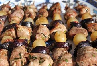Monter les brochettes en alternant un cube d'agneau, un quart de figue et un grain de raisin et recommencer l'opération.