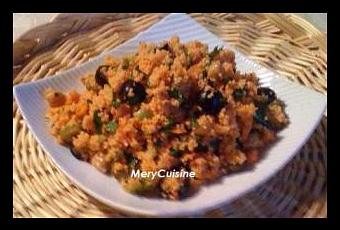 Ingrédients:250g (1 tasse) de couscous de blé2 poivrons verts rôtis coupés en dés 2 tomates mûres, épépinées et coupées en cubes.125 g d’olives noires dénoyautées, coupées en rondelles