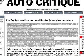 Le site NPA-auto-critique.org est comme son nom l’indique une émanation du Nouveau parti anticapitaliste, mais centré sur le secteur de l’automobile. C’est une source relativement intéressante si l’on souhaite prendre la température des tensions à l’œuvre dans la branche, et des positions respectives de certains syndicats.