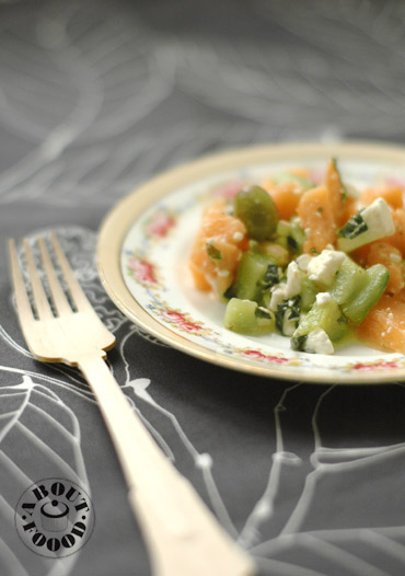 Allez, avouez que comme moi, vous avez essayé d'acheter des melons jusqu'à la toute fin de l'été pour ne pas dire le début de l'automne, pour prolonger ce moment de bonheur qu'est la dégustation de ce fruit parfait. Je dois dire que j'ai une chance folle, je dirai même peut-être une sorte de don inoui, pour trouver tel un trésor, le meilleur melon parmi les cinquante boules qui trônent devant moi. A chaque fois, je choisis THE melon. Non mais vraiment, je suis fière de moi, c'est quand même pas donné à tout le monde non? Et vu le froid qu'il commence malheureusement à faire, que vous ressortez collants et bottes fourrées et que vous allez bientôt me demander des recettes de soupes, eh bien moi je poste avec tristesse et nostalgie ma dernière recette de l'été, fraîche comme la rosée. Idée d'une salade mangée chez les parents cet été avec en prime les melons et concombres tout juste cueillis du potagerLes Ingrédients- 1 concombre- 1 melon- des feuilles de menthe- des olives vertes ou noires- de la feta- 1 citron