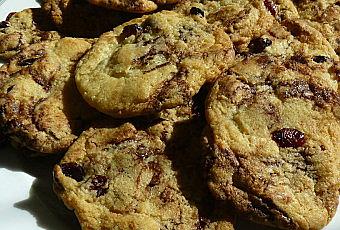 Pour ces délicieux gâteaux, la garniture se compose pour une fournée de cranberries séchées et de pépites de chocolat et pour la deuxième fournée de pistaches et de pépites de chocolat.