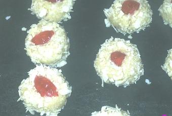 mélanger les amandes, le sucre, la vanille, le zeste de citron et le beurre. ajouter ensuite le premier oeuf et rajouter par petite quantité le deuxième oeuf au besoin pour obtenir une pâte malléable. faites 15 boules de pâte les passer dans le blanc d'oeuf puis dans les pignons. (amandes effilées) mettre une demi cerise confite au centre de chaque gâteau. les disposer sur un plateau allant au four légèrement huilé. faites cuire au four préchauffé a 160 degrés pendant 15 minutes laisser refroidir et les étaler avec la gelée ou le miel juste pour décorer .(pas fais)