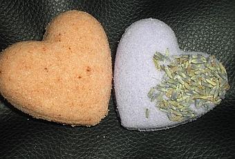 bicarbonate*60 grammes d'acide citrique*13 grammes d'huile d amande douce *quelques pschitts d' eau si besoin*Pour une, fleurs de lavande et huile essentielle de lavande *pour l 'autre huile essentielle d'orange et de verveine odorante
