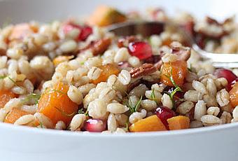 Faites cuire lʼorge perlé dans lʼeau bouillante salée pourquʼil soit tendre . Égouttez le et réservez le .Pendant que lʼorge cuit , pelez le 1/2 butternut , enlevez les graines et coupez le en petits cubes . Faites chauffer une poêle avec 2 cuillère à soupe dʼhuile dʼolive . Ajoutez les cubes de courge et faites cuire pendant 15 minutes à feu vif en remuant souvent . Ajoutez 2 cuillères à soupe de sauce soja , mélangez . Ajoutez 2 cuillères à soupe dʼeau et laissez cuire à feu moyen 10 minutes .( ne pas salez car la sauce soja sʼen chargera) Dans un saladier versez lʼorge cuit , ajoutez le zeste et le jus de lʼorange . Versez les 2cuillères dʼhuile de colza et la crème de vinaigre balsamique . Ajoutez les dés de courge et la moitié du bouquet dʼaneth ciselé .Ouvrez la grenade et récupérez les graines et ajoutez les dans le saladier . Poêlez 3/4 minutes les noix de pécan et cassez les en petits morceaux et ajoutez les à la salade. Mélangez tous les ingrédients de la salade ,salez et poivrez et dégustez la tiède .