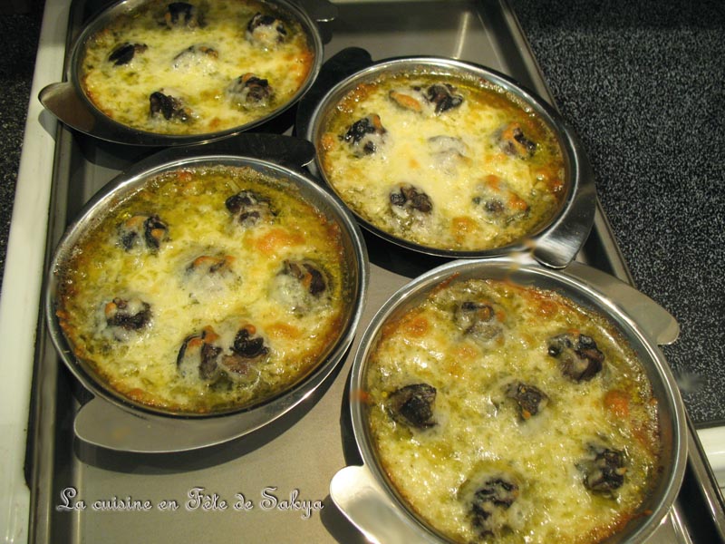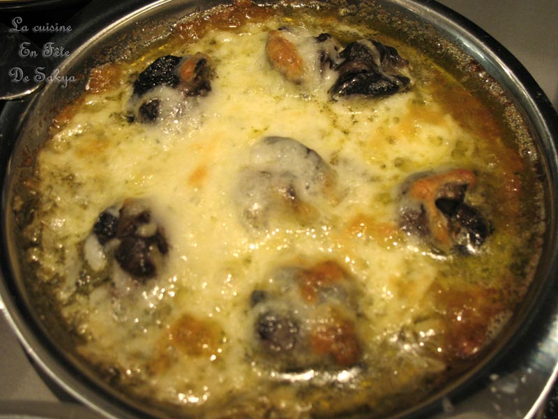 Verser une quantité du beurre à l’ail dans chaque assiette et ajouter le fromage sur le dessusFaire gratiner jusqu’à ce que le fromage soit fondu sans plus sinon vos escargots seront trop durs.