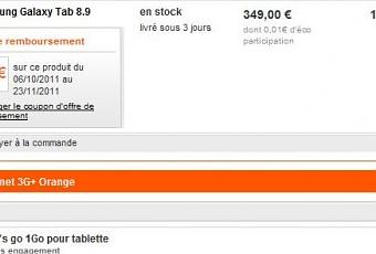 Encore une offre plutôt intéressant chez Orange avec aujourd’hui, la Galaxy Tab 8.9 de Samsung à 349 euros ! Vendue 579 euros en général, il vous faudra pour l’avoir à ce prix, la prendre sur le site de l’opérateur avec un forfait sans engagement « Let’s go 1 Go pour tablette » de 34 euros par mois que vous résilierez alors dés le 1er mois. En gros cela vous fera la tablette Galaxy Tab 8.9 à 380 euros…