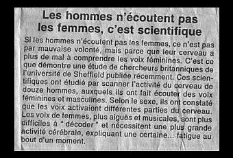 Ca m'intrigue, cette histoire quand même. Parce que tu as noté que ton mec ne t'écoute pas, mais tu nesavais pas qu'il y avait une raison. Et s'il ton mari apprenait ça, il tel la jouerait genre c'est de ta faute, enfin, c'est de la faute à son pauvre cerveau de mâle et c'est la nature et blablabla...