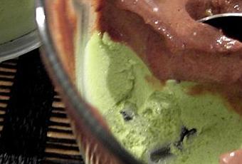 * Porter à ébulllition la crème liquide avec le sucre et hors du feu ajouter la gélatine bien essorée en pressant entre vos mains.Remuer afin de les dissoudre complètement. Laisser refroidir quelques instants puis incorporer la pâte de pistache. Bien mélanger. Passser au chinois si nécessaire.
