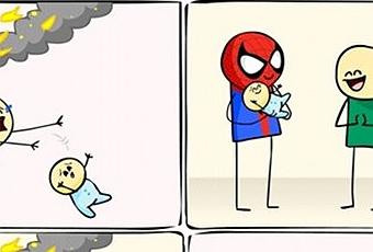 Petit cours de sauvetage de bébés version super-héros. Batman, Spiderman et Wolverine passent l’épreuve de rattrapper de grumeau. Tous les 3 ne sont pas à égalité, quelques bourdes sont à prévoir. Qui veut une tranche de jeune pousse dès le matin? Un petit strip qui prête à sourire, merci à Univers Marvel and Co pour la découverte. Au passage, filez lire ce blog, si vous aimez les comics, vous trouverez votre bonheur. De belles illustrations, des cours sur les proportions en dessins et d’autres astuces, un petit rayon de soleil à rajouter dans ses favoris si vous ne le connaissez pas.