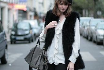 Vêtements : Slim h&m, chemise en soie vintage, Veste en plumes René Derhy, Bottines André, sac emprunté à Lydia