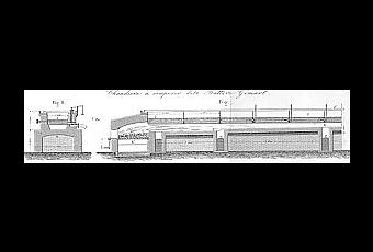 L’inclinaison du fond des chaudières se dirige vers le foyer, de façon que le liquide entre par la 8éme chaudière, parcourt successivement toutes les autres jusqu'à la première, qui est placée immédiatement au-dessus du foyer. Par une combinaison ingénieuse, un large bord garnit extérieurement le faite des chaudières et établit ainsi un canal d’un bout à l’autre; ce canal a une pente en sens inverse du fond des chaudières, de sorte que les écumes produites par l’ébulition s’y déversant, retournent vers la première chaudière, où elles sont recueillies.