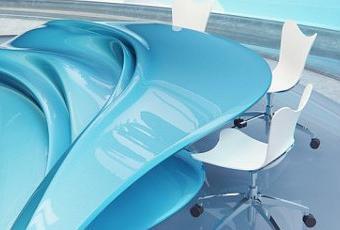 Nuvist Architecture & Design est une agence qui travaille en particulier pour des studios de télévision. Voici une de leurs dernières créations : la table Ekspoze 5, qui justement conviendrait parfaitement à un plateau de télévision. Toute en fluidité, la table Ekspoze est digne des plus belles carrosseries de voitures. A l’instar du piano Hydra d’Apostol Tnokovski pour Lady Gaga tout aussi « glossy », la création affiche un tablier interminable courant au sol. Les designers ont directement puisé leur inspiration dans les courbes anatomiques et l’écoulement des fluides. La conception de la table est évidemment assistée par ordinateur, les designers ayant eu recours à des logiciels de modélisation en trois dimensions. Le processus de fabrication a ensuite eu recours à de nouvelles méthodes de production avec un éventail de matériaux de haute technologie : Corian, fibre de verre, plastique renforcé et polyuréthane. La table Ekspoze est proposée en deux teintes : noir et bleu ciel.