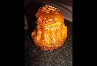 Pour servir, verser un peu de caramel dans le petit trou des cannelés et saupoudrer de miettes de crèpes dentelles.