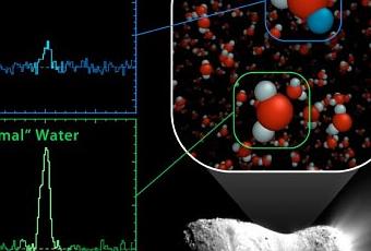 Profitant du passage au périhélie, puis dans les parages (16 millions de km de la Terre !) de la comète Hartley 2 en novembre 2010, les chercheurs ont pointé le télescope spatial Herschel et son spectromètre infrarouge HIFI (Heterodyne Instrument for Far Infrared) afin d’étudier la composition physico-chimique de sa longue chevelure. Issue de la lointaine réserve de la « ceinture de Kuiper », aux confins du système solaire, la comète qui revient tous les 6 ans et demi à proximité du Soleil, a révélée posséder une glace d’eau comparable à celle que l’on trouve sur Terre.