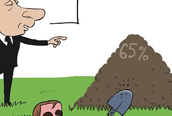 Selon le quotidien Vedomosti, le Kremlin aurait ordonné aux administrations régionales de faire en sorte que le parti Russie unie de Vladimir Poutine fasse au moins 65% aux élections législatives de décembre prochain, soit légèrement plus qu'il y a quatre ans. Le parti Russie unie a démenti cette information, mais Sergueï Elkine en a fait un très bon dessin (comme toujours), avec un Dmitri Medvedev "creusant sa tombe", avec le sourire, pour laisser sa place de Président à Vladimir Poutine.