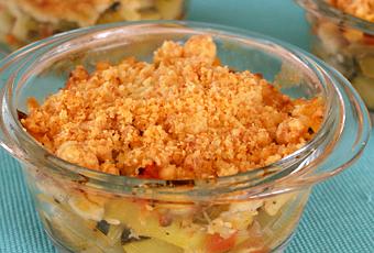 9. Dans des minis-cocottes ou dans un plat à gratin de taille moyenne, versez les légumes. Puis émiettez par-dessus le crumble au parmesan afin de recouvrir entièrement les légumes.