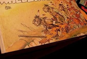 S; du Aaablog est en admiration devant sa trouvaille. Il salive intérieurement. Il le veut... Il le veut mais il résiste car je le regarde d'un sourcil inquisiteur. Il s'agit donc de la très belle première édition de Fort Wheeling de Hugo Pratt. Une édition totalement italienne – Archivio Internazionale Della Stampa Fumetta, pour être précis – sur beau papier, pratiquement au format des originaux, ici très bien réproduits, avec des noirs bien noirs et pas baveux.