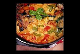 - Mettre un peu d'huile dans une poêle et verser le mélange. Cuire à feu moyen en ramenant les bords de l'omelette vers le centre au fur et à mesure de la cuisson. Saupoudrer de parmesan râpé avant la prise de l'omelette et finir la cuisson sous le gril du four pendant 2 à 3 mn. Décorer de feuilles de basilic et servir tiède ou froid.