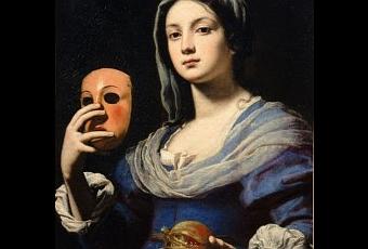 "Ce portait d’une jeune femme tenant d’une main un masque et de l’autre une grenade ouverte est une allégorie peu commune car ces deux attributs ne sont jamais associés. Le masque est l’emblème du théâtre, de l’imitation, mais aussi de la fausseté, du mensonge et de la dissimulation. La grenade, dont l’écorce renferme de nombreux petits grains, évoque l’unité, voire la démocratie, mais aussi la fausse apparence car elle réserve parfois des surprises une fois ouverte.