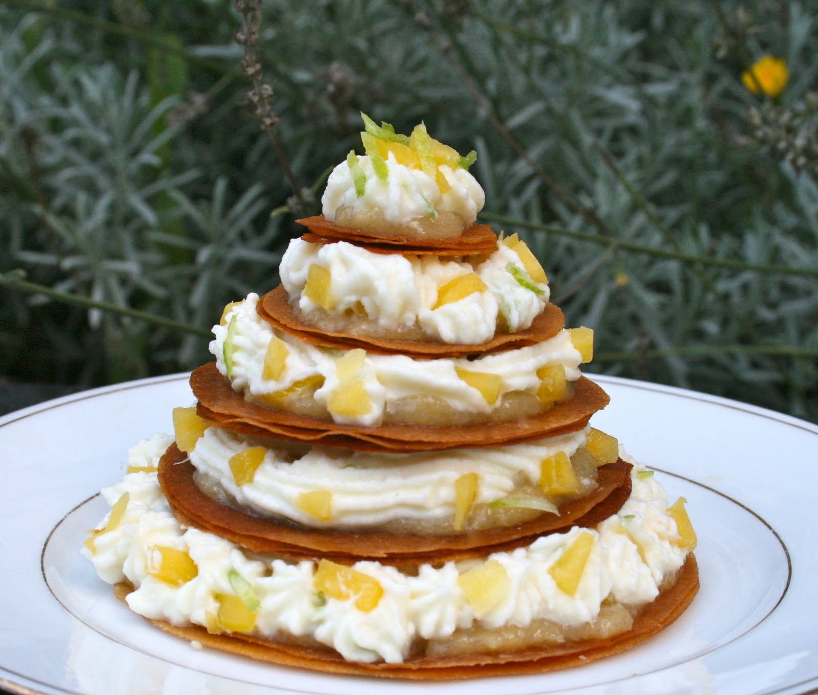 Aujourd'hui, je vous présente la 2° recette que j'ai proposé au site Cuisine AZ dans le cadre de leur dossier 100% blogs sur les grands classiques revisités. Alors, après la cuisson au micro-ondes avec mes oeufs cocottes, voici la recette cuisson au four. J'ai choisi de revisiter le millefeuille que j'ai voulu plus léger avec des feuilles de brick et que j'ai présenté un peu comme une petite pièce montée. Les différences de textures sont un délice en bouche, le croustillant des feuilles de brick, le sucré de la mangue, l'acidité du citron vert et l'onctuosité des crèmes... un dessert facile et gourmand.