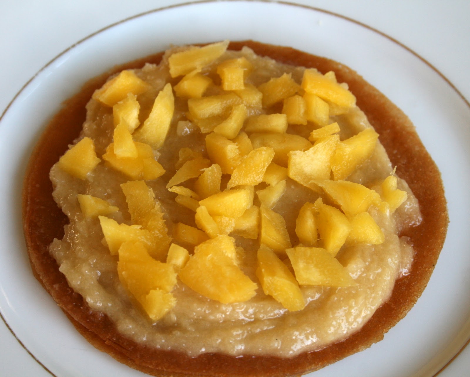 - Déposez des dés de mangue sur tous les pourtours recouverts de crème mascarpone.