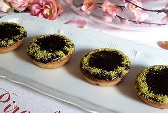 Lorsque les tartelettes sont cuites (verifier en soulevant délicatement une tartelettes que le fond soit légèrement doré) les remplir de ganache au chocolat et saupoudrer de poudre de pistaches pour décorer.