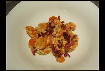Dans une poêle, faites chauffez l’huile d’olive. Ajoutez l’oignon émincé et à feu vif, faites dorer l’oignon. Ajoutez les lardons. Une fois grillés, baissez le feu et ajoutez les carottes, le sel (très peu car les lardons sont salés), le poivre et le persil.