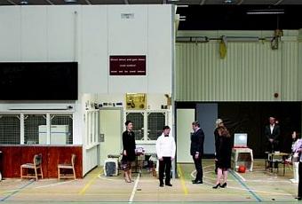 De la même manière que dans Maeterlinck (joué il y a quelques années au Théâtre de l’Odéon) qui se déroulait dans un atelier d’ouvrières, le lieu de ± zéro (représenté au Théâtre de la Ville en septembre) est très déterminé : au Groenland, un colloque de climatologie réunit des scientifiques du monde entier. Dès l’ouverture, un groupe de personnes méconnaissables parce qu’excessivement emmitouflées entre sur le plateau, entre éclats de rire et curiosité. Derrière la porte du fond, le dehors, derrière celle de devant, un placard… On se croirait dans un salon, mais c’est dans un gymnase que nous sommes. Christoph Marthaler mêle des éléments tout à fait réalistes à des éléments absurdes : le décalage qui naît de ce mariage, cette façon d’injecter de la folie poétique dans le réel, emmène le spectateur dans un espace et une temporalité étirés, drôles et mélancoliques.