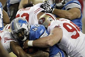 Les habits de ces deux équipes forment un bel assemblage de couleurs, c'est visuellement agréable. Après un three and out des Lions, les Niners reprennent mais Alex Smith perd le ballon suite à un sack de Kyle VandenBosch. Celui-ci reprend et les Lions semblent en voiture. Un manque de cohésion dans la zone rouge limite toutefois le Detroit à un placement. 3-0. La foule de Detroit est encore possédée du démon, forçant les Niners à commettre des faux départs à répétition. La ligne offensive du Frisco était supposée être une grave faiblesse cette saison, ils ont peut-être frappé leur Waterloo aujourd'hui. Comme d'habitude, l'attaque des Lions met un certain temps à se mettre en marche mais on a finalement droit à un touché avec 5 minutes à faire au 1e quart. Un match épique de Brandon Pettigrew sur 16 v. 10-0 Lions. Frank Gore réussit à donner de la vie à son attaque avec une longue course jusqu'à la ligne de 1 adverse. Gore termine le tout lui-même avec un TD d'une verge. 10-7 Lions en début de 2e quart. L'attaque des Lions demeure hésitante et accorde même un safety en milieu de 2e quart. Ha ben coudonc, 10-9 Lions. Le Detroit a une belle opportunité d'ajouter un touché à son avance en fin de 2e quart mais une pénalité pour chop block les force à tenter un long placement, raté par Jason Hansen. La bonne position sur le terrain donne la chance aux Niners de prendre les devants sur un placement avant la pause: 12-10 SF. D'un côté, les Niners jouent exactement le genre de match qu'ils voulaient mais de l'autre, les Lions sont les rois du comeback. Ça promet pour la 2e demie.