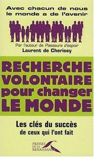 52 ans, cinq enfants, Laurent de Cherisey rapporte un enthousiasme sans faille de son tour du monde, une confiance inoxydable en l'homme. Son idée est que l'information délivrée est terriblement anxiogène, que les idées positives ne sont pas assez mises en valeur. Ancien chef d'entreprise, co-fondateur du réseau Reporters d'Espoirs, Laurent de Cherisey cherche des volontaires pour changer le monde !Edité aux Presse de la Renaissance, cet ouvrage répond avec énormément d'exemples à cette question que nous nous posons chaque jour : y-a-t-il une autre façon de vivre notre quotidien ? Son livre n'est pas une remise en cause du capitalisme mais plutôt une mise en avant de la capacité créatrice que possède chaque être humain. Montrer que des gens partent de rien, refusent la fatalité, dépassent la peur de l'autre pour pouvoir travailler ensemble, tout en refusant le communautarisme et le repli identitaire.
