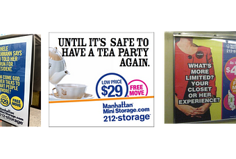 Alors, les options de stockage d’appoint à proximité sont importants, notamment Manhattan Mini Storage. En gros, c’est notre version de Une Pièce en Plus mais à Manhattan. Je n’ai jamais eu à faire à leurs services mais leurs publicités sont partout et surtout pleines d’humour. Les thèmes sont toujours les mêmes: le manque de place, New York et le reste du monde (Des Moines, Iowa?), et les républicains. Les new yorkais ont une allergie aux républicains et les publicités ci-dessous le prouvent. Tout le monde en prend pour son grade.