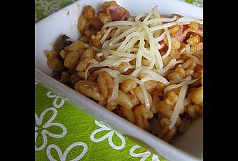 -1 verre de blé - 2 tranches de jambon blanc - 1 poignée de champignons de paris surgelés - 1/2 boule de mozzarella - 1 cube de bouillon de légumes - thym et basilic