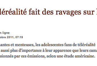 “Et ces fans de téléréalité sont 68% (contre 50% des autres) à considérer qu’il est “dans la nature des filles” d’être méchantes et en compétition les unes avec les autres. Elles sont également 78% (contre 54%) à considérer que la commérage est normal dans une relation entre filles (…) De manière générale, selon l’étude, les adolescentes fans de téléréalité ont plus souvent tendance à “mettre l’accent sur la méchanceté et le mensonge pour parvenir à (leurs) fins”, souligne un communiqué. (…) Pour autant, ces jeunes filles, selon l’étude, se considèrent matures, intelligentes, amusantes et ouvertes.” (Le Soir)