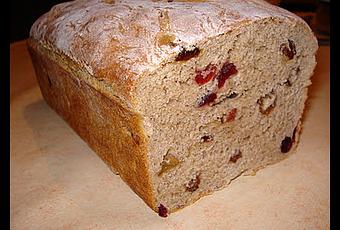Placer les ingrédients dans la cuve dans l'ordre préconisé par le constructeur (la mienne c'est : tous les liquides, le sel, le sucre au fond, puis la/les farines et pour finir la levure). Enclencher le programme "pâte seule" (1h50 sur ma MAP). Au "bip" d'ajout d'ingrédients (après la première levée, la machine pétrit la pâte), ajouter les raisins et les cranberries. Attendre la fin du cycle.Beurre un moule à pain puis verser la pâte sur un plan de travail fariné et la former en boudin, sans la pétrir trop, pour éviter de faire sortir trop d'air. Placer le pâton bien fariné dans le moule beurré, puis laisser reposer 30 à 45 min (selon la température de la pièce) sous un torchon propre.Faire préchauffer le four à 180°C. Vous pouvez donner un "coup de buée" en jetant de l'eau dans la lèche-frite avant d'enfourner le pain, mais en ce qui me concerne, je ne suis pas fan de croûte, donc je me passe de cette étape.Mettre ensuite à cuire pour 30 à 40 minutes.Je cuis peu le pain, car il passe quasi-systématiquement au grille pain.