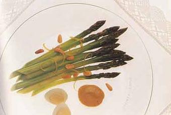 Ingrédients pour 4 personnes : 2 bottes d’asperges Asparagus (vertes), 4 œufs, 1 citron jaune non traité, 2 cuillères à soupe de pignons, 2 cuillères à soupe de moutarde à l’ancienne aux oignons, 10 cl de vinaigrette à l’orange.