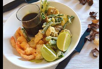 Préparation : 1- Commencez par faire cuire à l'eau vos pommes de terre. Pendant ce temps préparez les crevettes (ôter la tête, les pattes et la carapace), découpez le poisson en morceaux correspondants à une bouchée. Faites des entailles au couteau sur le chapeau des champignons et découpez tous vos ingrédients en morceaux de 4-5cm, toujours de manière à correspondre à une bouchée. Une fois les pommes de terre cuites, coupez les également. Puis roulez tout dans de la farine. 2- Faites frémir dans une casserole les ingrédients pour la sauce d'accompagnement, laissez sur le feu jusqu’à ce que les tempura soient prêts. 3- Mélangez dans un grand bol les ingrédients pour la pâte. Le résultat idéal doit être grumeleux et pas trop épais. 4- Chauffez l'huile à 170°C. Pour savoir si votre huile est suffisamment chaude, versez quelques goutes de pâte dedans, elles devraient frire instantanément. 5- En commençant par les produits de la mer, puis ensuite les légumes, plongez vos ingrédients successivement dans la pâte puis dans l'huile pour les faire frire. Utilisez des baguettes pour plus de simplicité. La pâte étant un peu liquide, il n'y en aura pas excessivement sur les ingrédients, c'est normal. Une fois légèrement bronzés (pas trop !), vos beignets sont prêts. Sortez-les et disposez-les sur un papier absorbant, puis placez-les dans l'assiette. Finissez par l'oignon vert, ainsi vous pourrez tout plonger directement dans le restant de pâte et les faire frire par petits paquets. Le résultat doit à chaque fois être croustillant. Entre chaque sorte de tempura, supprimez les résidus de pâte de l'huile à l'aide d'un écumoire. 6- Votre assiette est remplie de tempura, ajoutez la sauce qui est encore sur le feu dans de petits ramequins ainsi que les sudachi coupés en quartiers. Vous pouvez également saler et ajouter du gingembre moulu selon vos goûts.