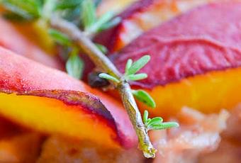 *** Ingrédients: 1 pâte feuilletée 4 pêches jaunes mûres mais fermes 8 belles tranches d'andouille de vire 4 cuill.à café de miel quelques branches de thym sel et poivre