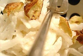 Bon, je vous ai laissé un peu de répit après ma saga sur les pêches de vigne... hein? Mais ça y est une autre attaque pointe déjà le bout de son nez... j'ai nommé le radis noir! Cette drôle de racine noire à l'extérieur et blanche à l'interieur, chez b&t, on la mange toujours sur une petite tartine de pain beurré avec un peu de fleur de sel... pas vraiment une recette donc... j'en conviens! Mais après 5 ou 6 gros radis noir... il faut commencer à réfléchir autrement, parce que Mr K, ne se satisfait pas de tartines tous les soirs! Et en cherchant sur le net, j'avoue ne pas avoir été complètement comblée! En effet, les recettes à base de radis noir ne sont, il faut bien se l'avouer, pas légion! J'ai quand même trouvé une association qui me plaisait bien à travers un gaspacho tout blanc sur le site épicurien.be... retransformé pour l'occasion en salade.