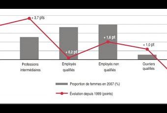 L’emploi poursuit sa féminisation : on compte 46,7% de femmes en 2007 contre 44,9% en 1999. Dans les années 1990, l’emploi des femmes a été surtout tiré par le développement des métiers déjà féminisés. Entre 1999 et 2007 en revanche, il s’accroît dans la majorité des métiers, quelle que soit la part des femmes. Avec des diplômes plus élevés, les femmes accèdent davantage aux postes à responsabilités, particulièrement ceux où elles étaient moins représentées : professions libérales, cadres et professions intermédiaires des secteurs public et privé, hors santé et enseignement. Les femmes réalisent même une forte percée à la tête de l’administration publique et des grandes entreprises, comme directeurs administratifs ou techniques : 30% des cadres d’état-major sont des femmes en 2007, contre 14% en 1999. Il y a également bien plus de femmes parmi les contremaîtres, agents de maîtrise, policiers, militaires et agents de sécurité, même si ces professions comptent encore une large majorité d’hommes. Les femmes gagnent du terrain aussi parmi les non-salariés : elles constituent 32% des artisans, commerçants et chefs d’entreprise, soit +1,7 point en 8 ans, comme chez les salariés. Elles sont en revanche moins souvent ouvriers non qualifiés ou agriculteurs exploitants qu’en 1999. Enfin, certains métiers à forte majorité masculine sont peu investis par les femmes (tuyauteurs, couvreurs, plombiers…), tandis que d’autres, largement féminisés, commencent doucement à accueillir quelques hommes (puéricultrices, assistantes maternelles, sages-femmes…)