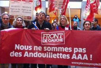 http://www.wat.tv/swfpu/218980nIc0K117302757« Parole directe » avec Jean-Luc Mélenchon : l’émission intégralePourtant, cette riche activité gauchiste se retrouve soudainement éclipsée des médias par la grâce de l’opération « andouillettes AAA chez Moody’s, l’agence de notation bien connue, qui possède des bureaux très discrets au 96, boulevard Haussmann à Paris. Ce matin, en effet, comme ces images le prouvent, un groupe du front de gauche a en effet pris possession duhall de Moody’s… distribuant des andouillettes aux cadres pressés. Cette opération de communication bienvenue (que même les journaux de droite évoquent…), fait suite à la décision de l’agence de notation, comme par hasard au lendemain des primaires, d’envisager la rétrogradation de la note AAA de la France, à l’issue d’ une période de surveillance… Une menace ?
