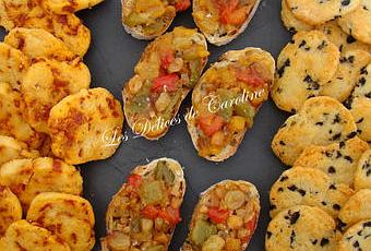 Voici une jolie assiette gourmande et colorée composée de petits biscuits au chorizo et aux olives et de petites tartines au confit de poivrons aux raisins, amandes et miel!