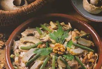 - Préparez une vinaigrette avec 3 cuillerées à soupe d’huile de tournesol, 1 cuillerée à soupe d’huile de noix et 1 cuillerée à soupe de vinaigre. Ciselez finement 1 cuillerée à soupe de cerfeuil, autant d’estragon et autant de persil. Réunissez les champignons et les branches de céleri émincées dans un saladier bas. Détaillez les fonds d’artichauts en lamelles et ajoutez-les par dessus. Ajoutez les échalotes dans la vinaigrette, salez et poivrez, versez cette sauce sur la salade et mélangez, ajoutez les fines herbes, les noix et servez.