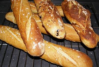 Prélevez de la pâte faite un boudin entre vos mains et le plan de travail (roulé contre le plan de travail en écrasant légèrement et en redonnant une belle forme en relachant la pression) Allongez ainsi vos pains , mettez les en forme , et installez-les sur une plaque à baguette aspergez d'eau et laissez reposer à nouveau une petite heure couvert d'un linge humide .