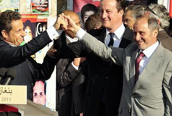 Nicolas Sarkozy et David Cameron reçus triomphalement à Benghazi le 15 septembre par Moustafa Abdel Jali, nouvel homme fort libyen. | REUTERS
