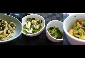 En ce qui concerne les repas, cela a commencé simplement : un bento japonais pour déjeuner ; des pâtes courgette, pignons, citron (changement de menu pour passer à une recette de pâtes qui se sert sans parmesan) ; un déjeuner dominical japonisant : salade de tofu, cresson, Goya chanpuru (un plat d'Okinawa avec tofu, porc, oeuf battu, poivron vert, concombre) ; un riz sauté au maquereau avec cresson ; des pommes de terre Rattes aux champignons, jambon.