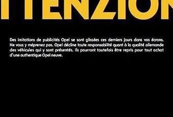 " Des imitations de publicités Opel se sont glissées ces derniers jours dans vos écrans. Ne vous y méprenez pas. Opel décline toute responsabilité quant à la qualité allemande des véhicules qui y sont présentés. Ils pourront toutefois être repris pour tout achat d'une autentique Opel neuve."