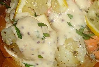 24 carrés de feuilles de filo- 2 cabillauds-2 pavés de saumon-50g de beurre-4 oignons nouveaux émincés-1 gousse d'ail écrasée-1 cas de coriandre ciselée-6 bonnes cas de crème fraîche- une goutte de tabasco-1 cac de moutarde à l'ancienne-persil plat-1/2 citron- sel et poivre du moulin
