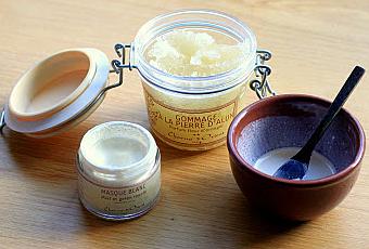 Dans un pot à rillettes / foie gras, il ressemble beaucoup à ces scrubs très à la mode composés d'huiles végétales gorgées de sucre ou de sel, mais celui-ci contient... de la pierre d'alun.