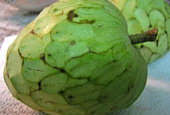 La Chirimoya de son nom Queshua ,est un Fruit natif des Andes et en particulier de Bolivie et du Pérou ou il est cultivé depuis plus de 2000 Ans.Il est le fruit de l´arbuste du même nom que l´on rencontre a l´état sauvage entre 1500 et 2 500 Mètres d´altitude,il fut implanter en Espagne par les Colons au 17 Eme siècle,pays qui depuis est d´ailleurs devenu le premier producteur Mondial mais on rencontre en fait la Chirimoya dans tout les Pays de Méditerranée de l´Italie a l´Egypte,c´est souvent d´ailleurs pour cette raison que le fruit est considéré comme de cette région ou il a été en fait adapté.La production Espagnole est peu exportée puisque la demande interne est forte et peine a la couvrir,on note que 64 % des exportations ont été faites vers la France ou le fruit connait un intérêt croissant. La Chirimoya est un fruit très sucré(60%) et il est souvent comparé en terme de saveur a l´Ananas,au Pérou il est consommé tel quel mais entre également dans beaucoup de préparations de desserts et autres Tartes.D´un point de vue personnel je dirais que les Chirimoya que l´on trouvent au Pérou sont beaucoup plus savoureuses que celles produites en Europe.On rencontre également la Chrimoya sous forme de pulpe en Bocal qui a l´avantage de pouvoir être conserver plus longtemps.