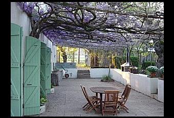 Côté sud de la maison, une très jolie terrasse de 150 mètres carrés sous une toiture de glycines donne sur un grand jardin, partiellement à l'ombre de marroniers et de cerisiers. Dans le jardin vous trouvez également la piscine avec sa terrasse et ses chaises longues.
